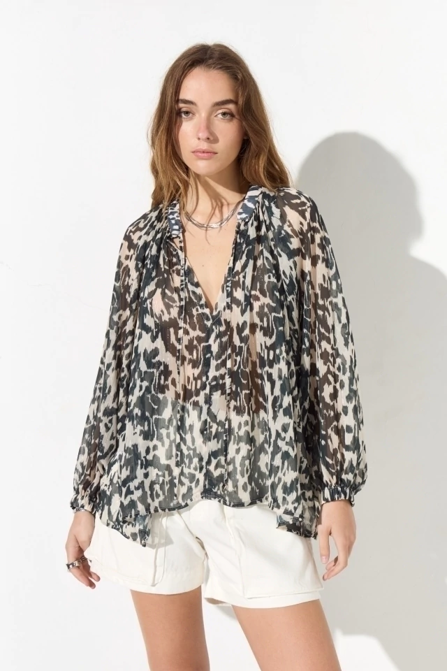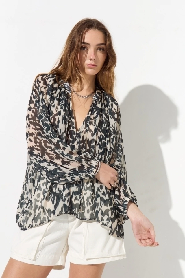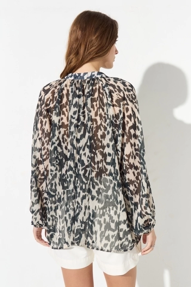Blusa confeccionada en gasa estampada con detalle de hilados de lurex, de calce holgado y escote V.