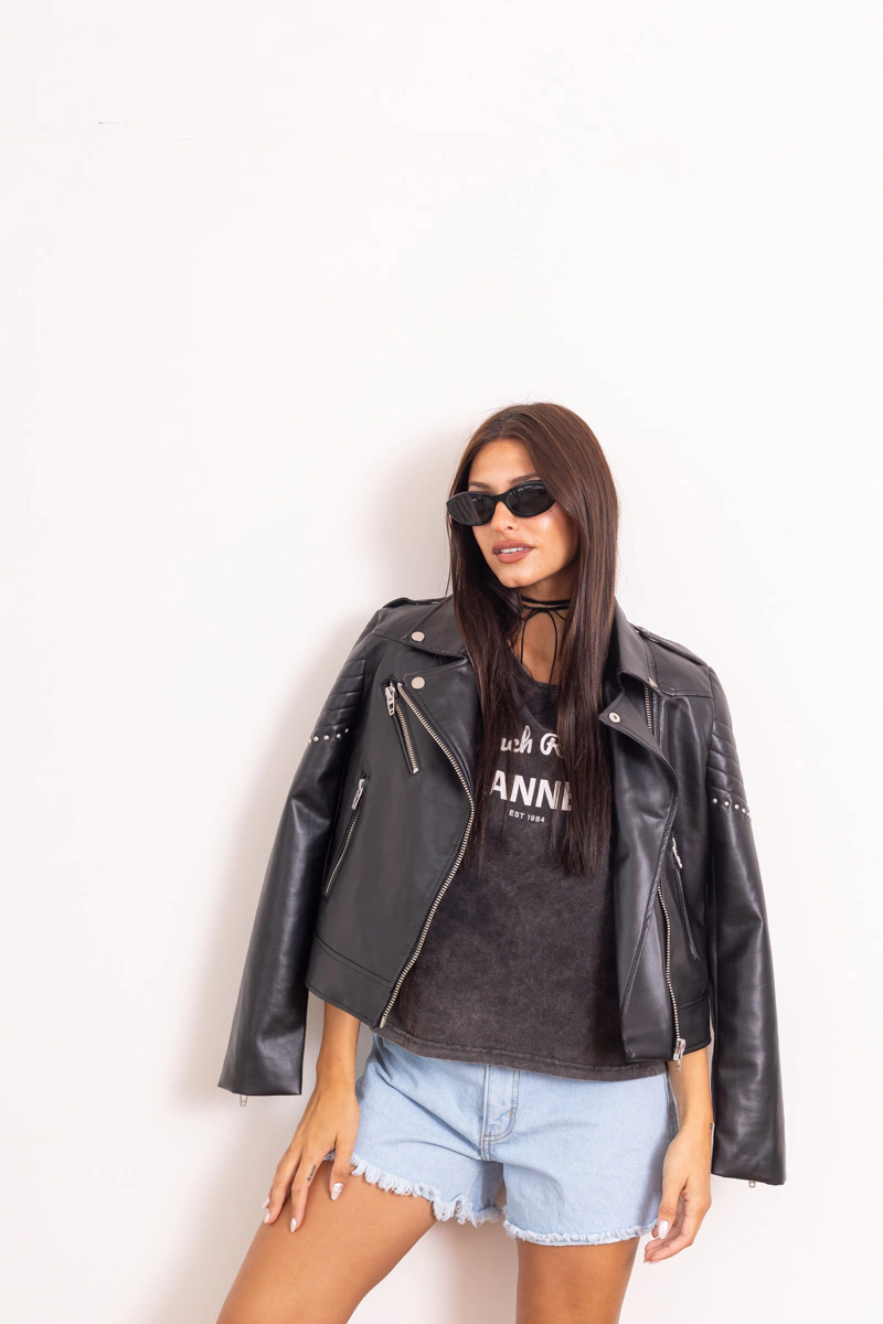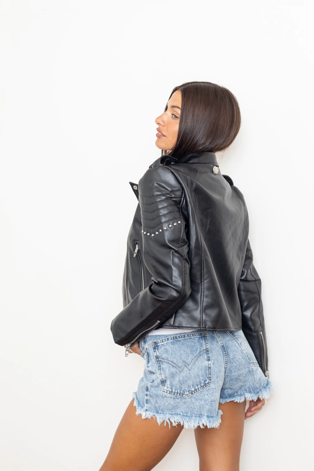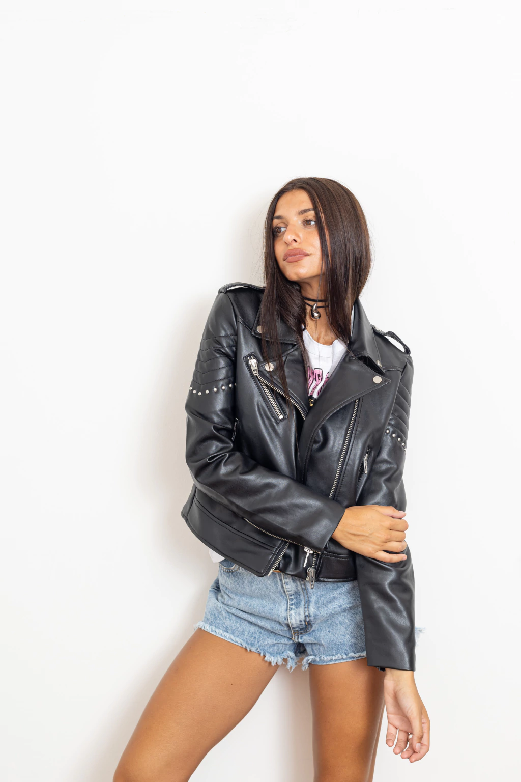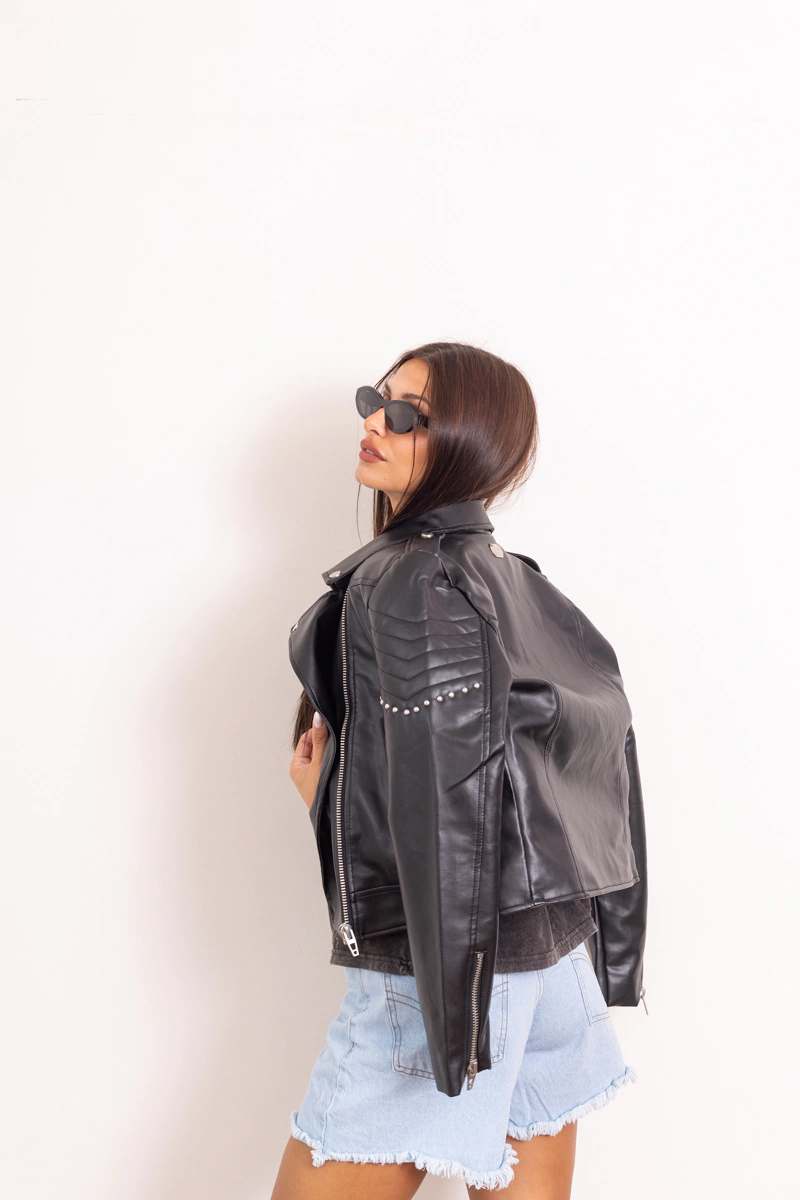 Campera de PU, corte moto con detalle de matelasse y tachas en mangas. Chapita metalica en centro espalda.