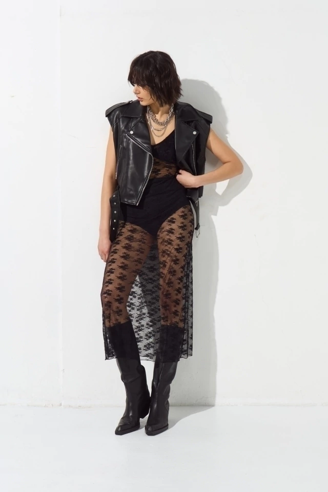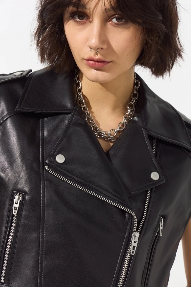 Chaleco biker corto con avíos metálicos con identificación de marca.