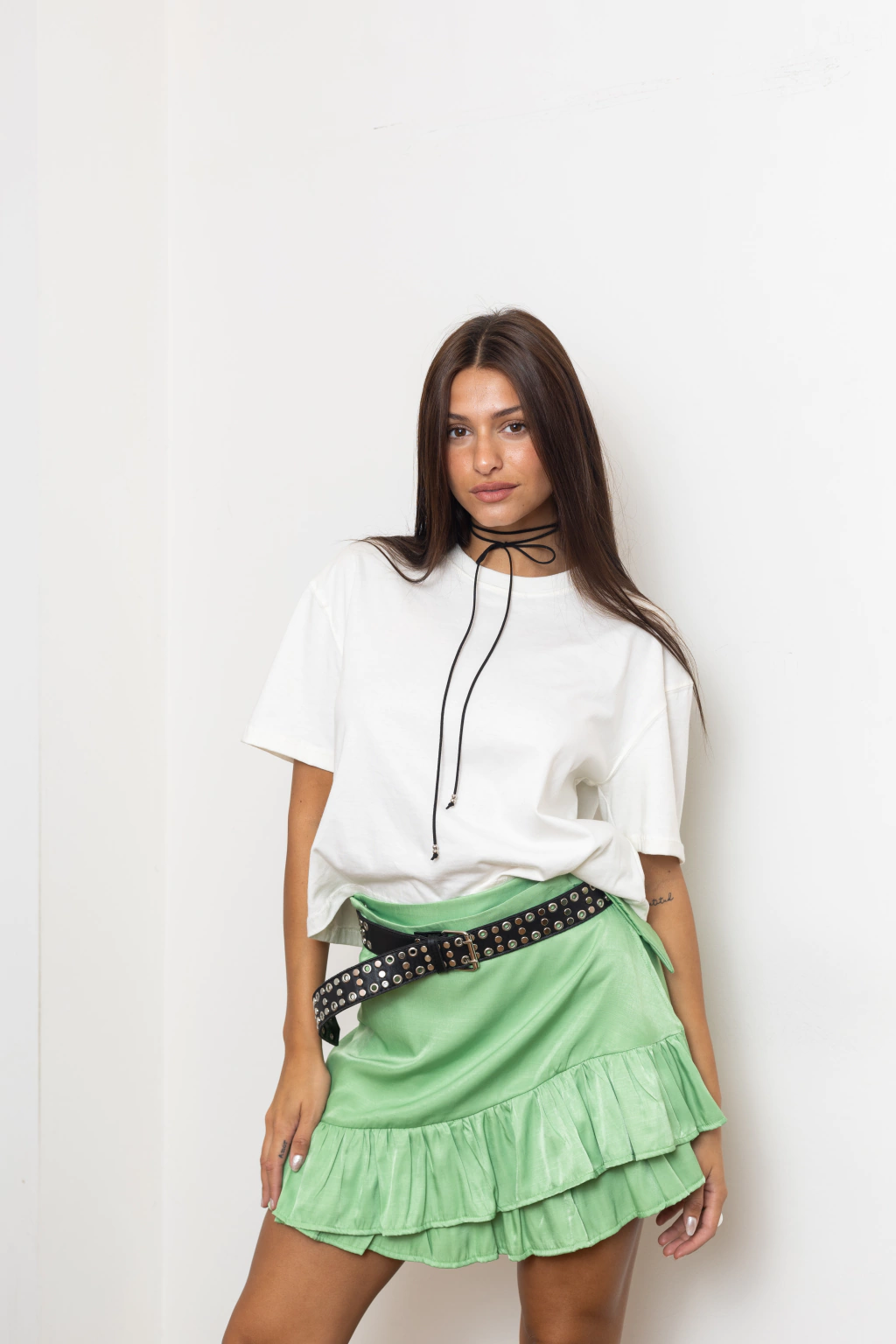 DESCRIPCIÓN: Mini cruzada con volado y lazo en el lateral. Confeccionada en una satín super suave y de un brillo leve