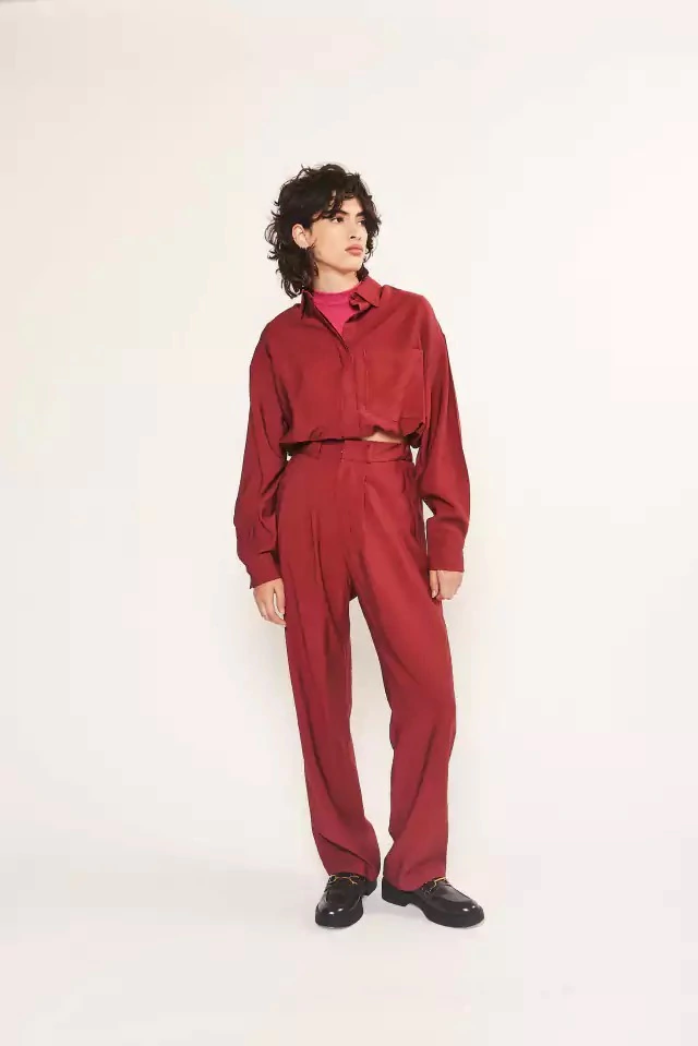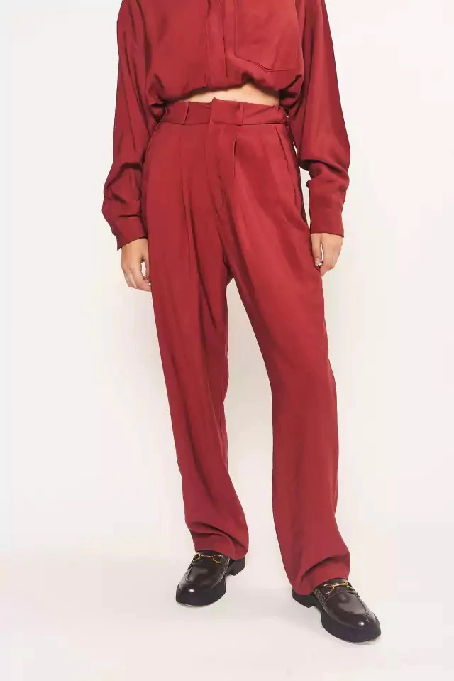 DESCRIPCIÓN: Pantalón pinzado de twill de rayón con cintura elastizada por la espalda. Grandes tablas en el frente, broche interno y patas rectas. Bolsillos ojal en espalda y bolsillos laterales.