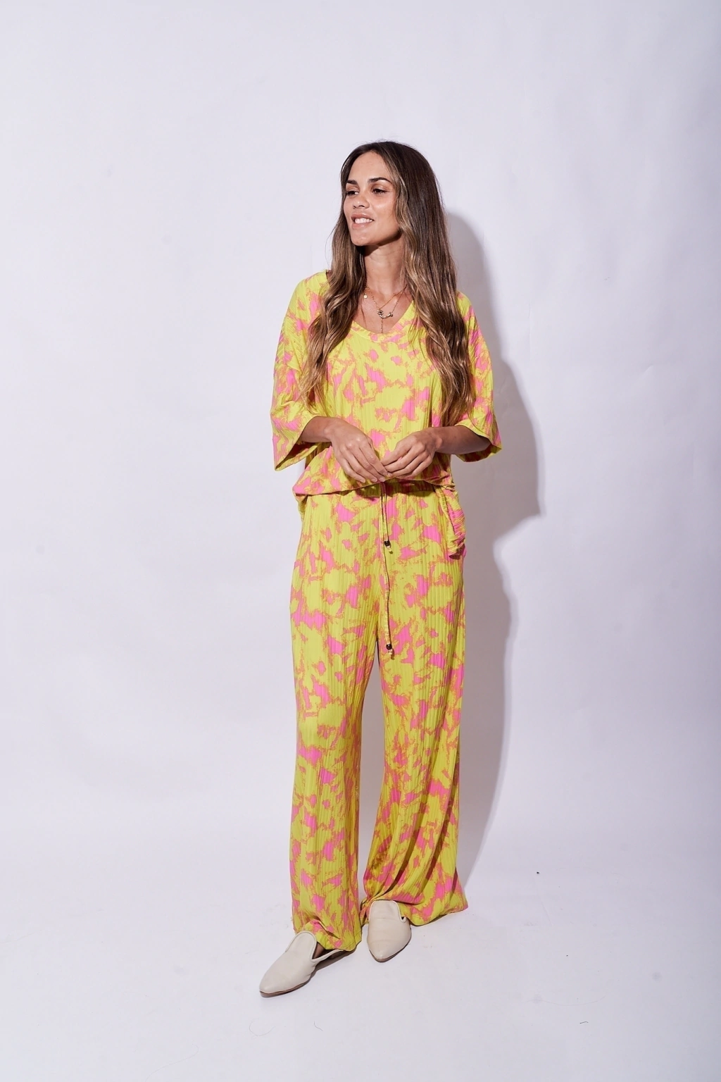 Palazo confeccionado en morley estampado, con cintura con elastico y cordon a tono. Tiene bolsillo a los costados.