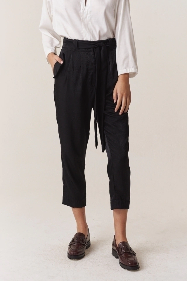 pantalón de corte recto, con bolsillos en laterales, lazo y cierre con botón.