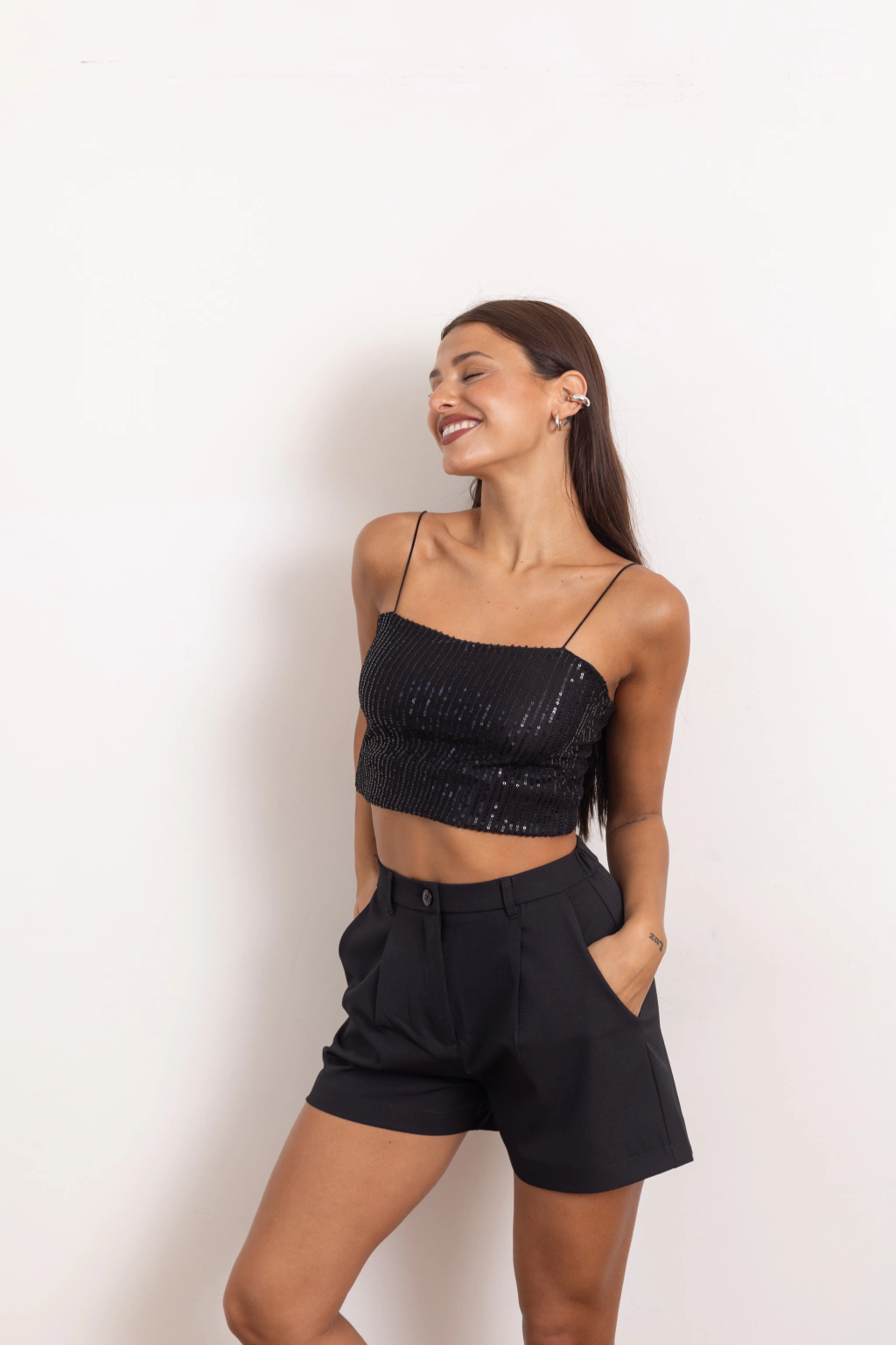 Top con lentejuelas, tiras a tono y cierre en el costado para ingresar a la prenda.