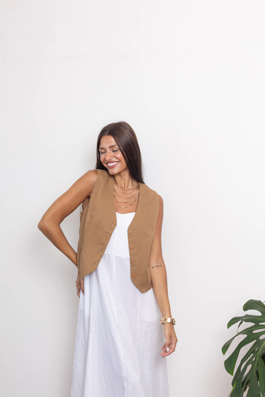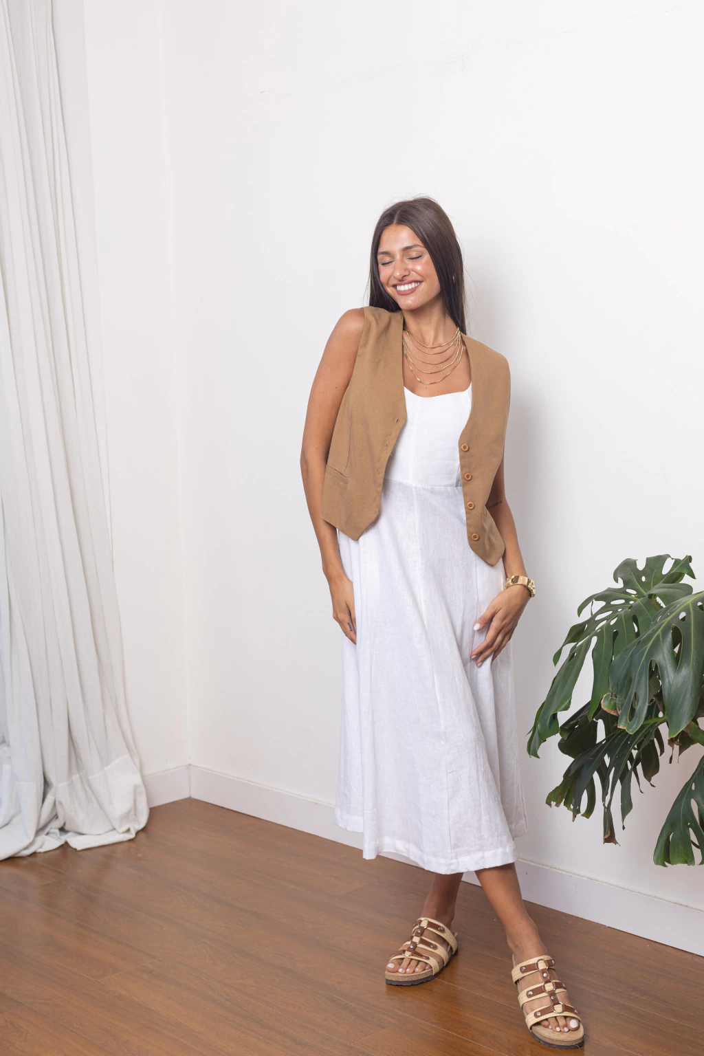 Vestido confeccionado en lino con escote corazon, corte cintura, bolsillos en laterales, elastico en espalda para que se adapte mejor al cuerpo.